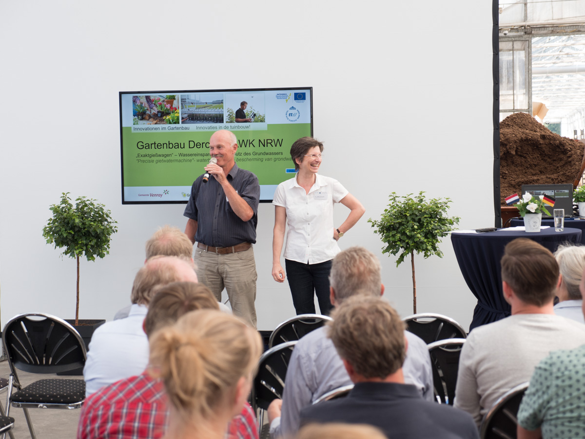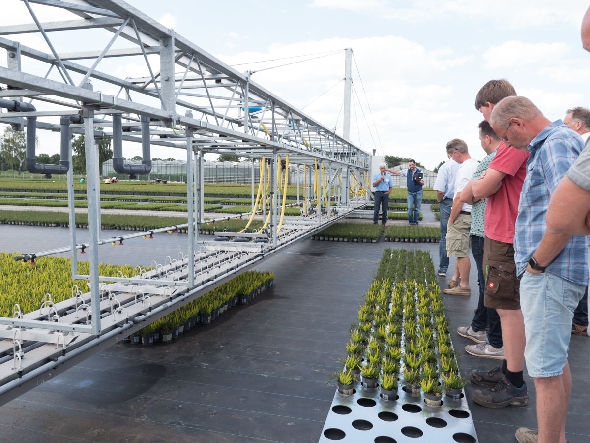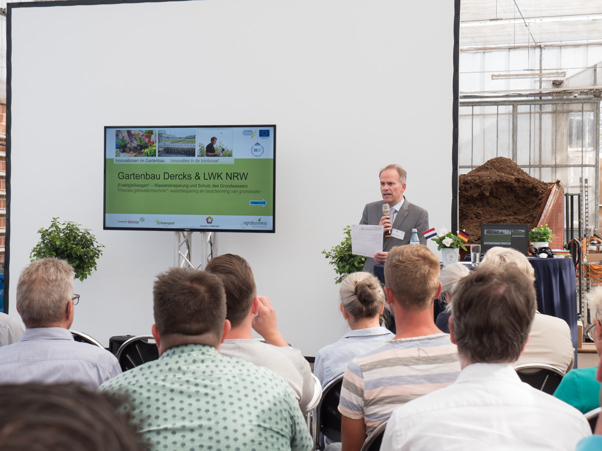 Ziel des Projekts „Agro Cross Borders“ ist die Förderung des grenzüberschreitenden Austausches von Unternehmen des Agrobusiness. Das ist mit der ersten Veranstaltung im Gartenbaubetrieb Dercks in Geldern/Walbeck auch gelungen. Die rund 60 Teilnehmer informierten sich zunächst über den Exaktgießwagen, der von Peter Dercks u.a. zusammen mit Klaus Karl von der Landwirtschaftskammer NRW entwickelt wird. Ziel des Gießwagens ist die exakte Abgabe von Wasser in die Pflanztöpfe auf den Freilandflächen. Wird kein Wasser zwischen den Töpfen gegeben, kann bis zu 70 % der Wassermenge eingespart werden. Der Gießwagen selber funktioniert bereits recht gut, jetzt gilt es ein Verfahren zu entwickeln, dass das punktgenaue Abstellen der Töpfe ermöglicht. „Wir sind in der Prototypphase mit dem Gießwagen“, sagt Dercks und geht davon aus, dass die offenen Fragen noch beantwortet werden. Gerne würde er dabei mit einer Firma zusammenarbeiten, die mit Gießwagen und das Absetzen von Töpfen vertraut ist.