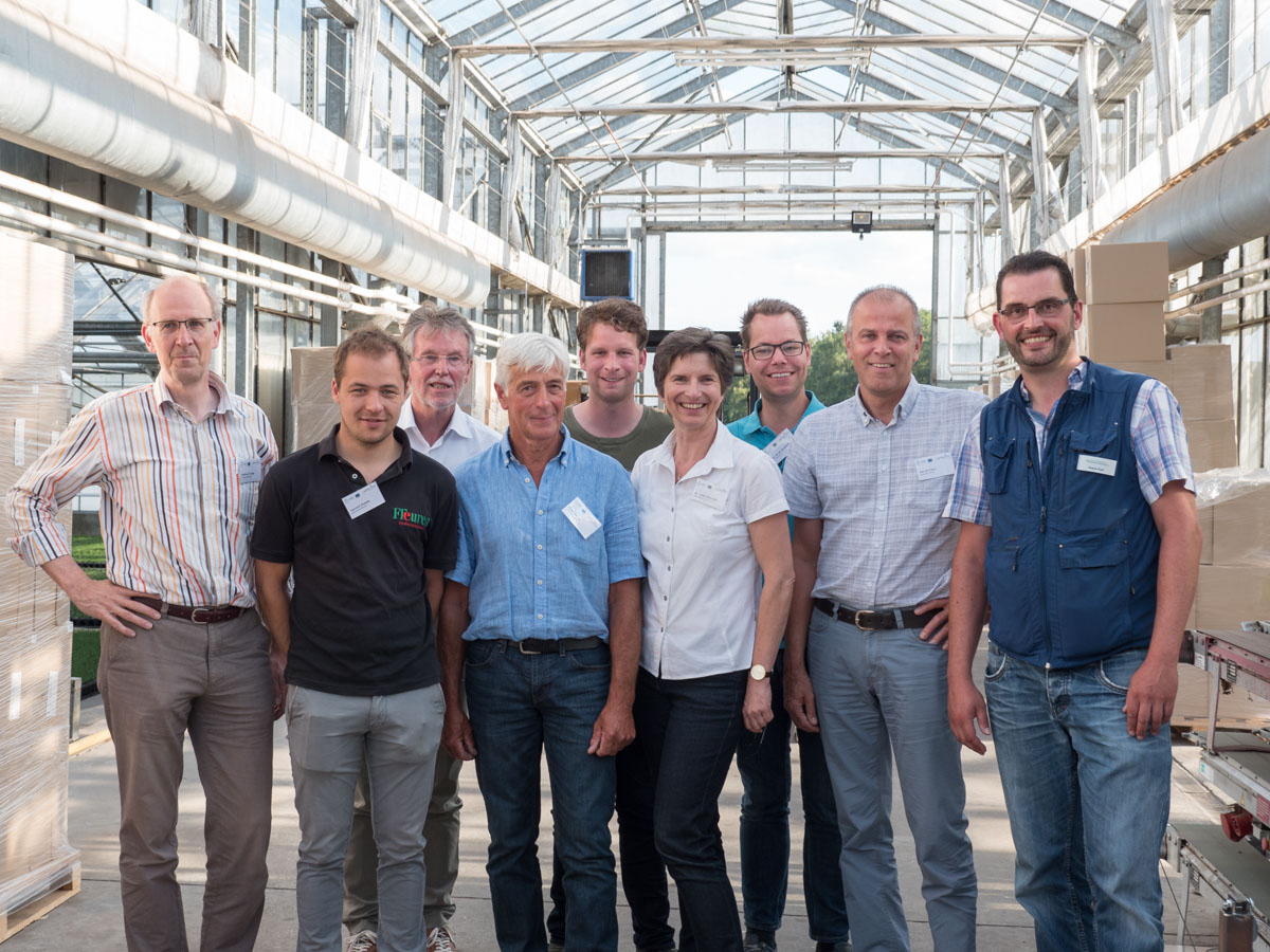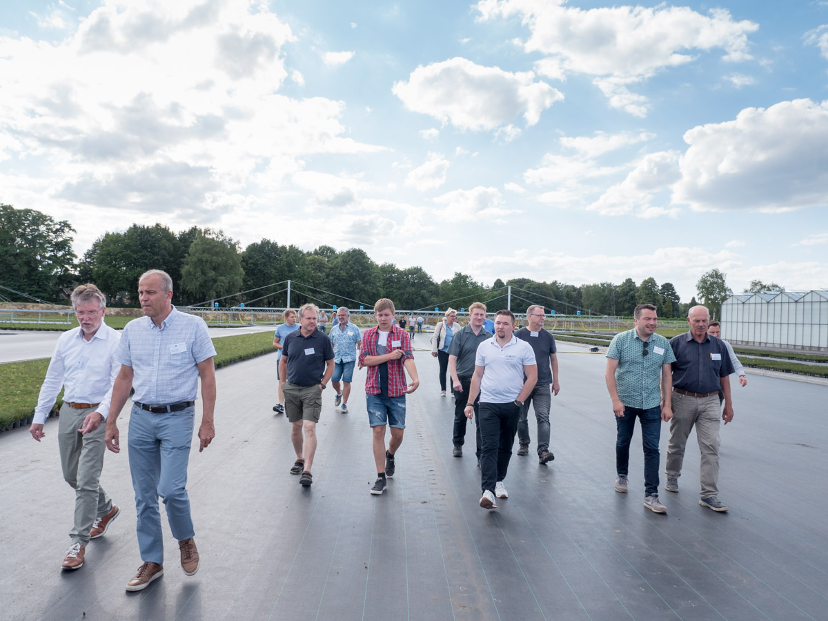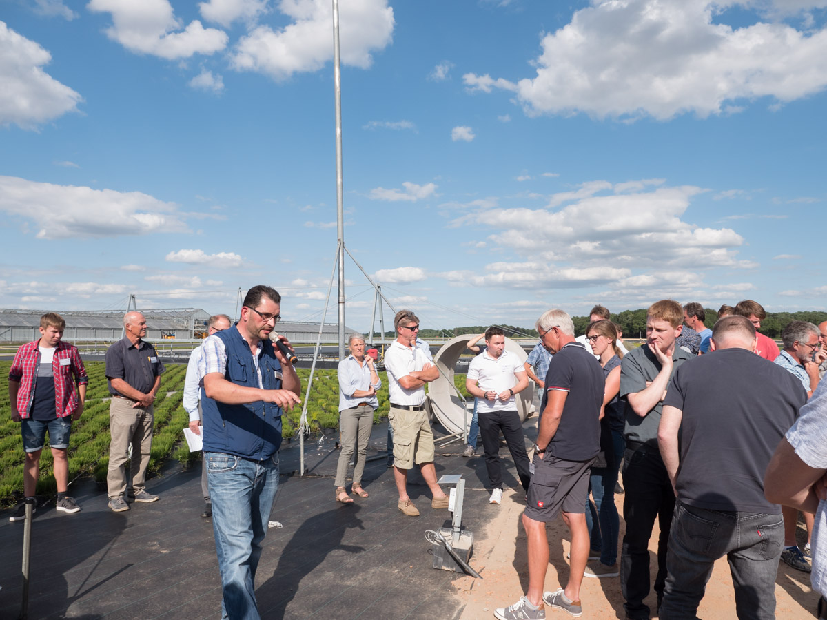 Ziel des Projekts „Agro Cross Borders“ ist die Förderung des grenzüberschreitenden Austausches von Unternehmen des Agrobusiness. Das ist mit der ersten Veranstaltung im Gartenbaubetrieb Dercks in Geldern/Walbeck auch gelungen. Die rund 60 Teilnehmer informierten sich zunächst über den Exaktgießwagen, der von Peter Dercks u.a. zusammen mit Klaus Karl von der Landwirtschaftskammer NRW entwickelt wird. Ziel des Gießwagens ist die exakte Abgabe von Wasser in die Pflanztöpfe auf den Freilandflächen. Wird kein Wasser zwischen den Töpfen gegeben, kann bis zu 70 % der Wassermenge eingespart werden. Der Gießwagen selber funktioniert bereits recht gut, jetzt gilt es ein Verfahren zu entwickeln, dass das punktgenaue Abstellen der Töpfe ermöglicht. „Wir sind in der Prototypphase mit dem Gießwagen“, sagt Dercks und geht davon aus, dass die offenen Fragen noch beantwortet werden. Gerne würde er dabei mit einer Firma zusammenarbeiten, die mit Gießwagen und das Absetzen von Töpfen vertraut ist.