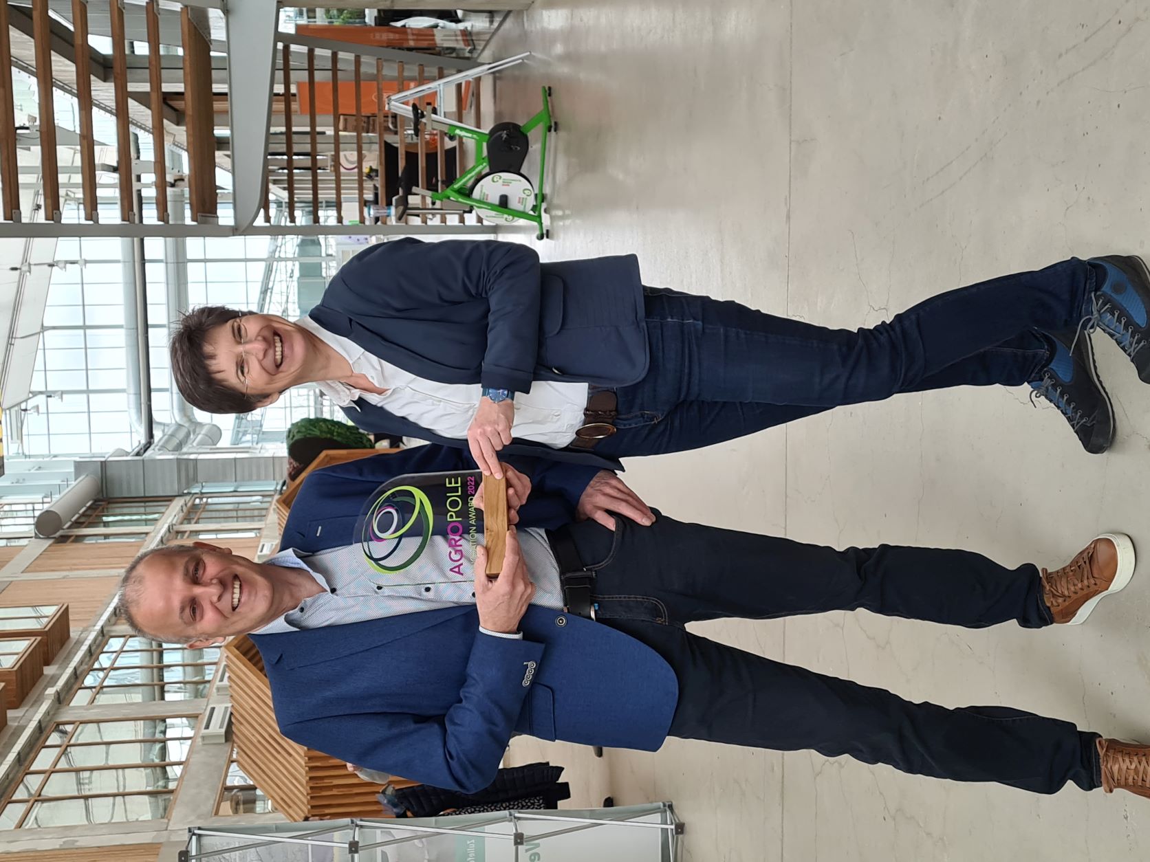 In den letzten zwei Jahren unterstützte das Agropole-Projekt sechs grenzüberschreitende Kooperationen, die Innovationen für die Branche entwickeln, mit jeweils bis zu 10.000 Euro. Die Projekte hinter diesen sogenannten Innovationsgutscheinen stellten sich am Donnerstag in der Villa Flora vor. Im Anschluss durften die rund 140 Teilnehmenden der Veranstaltung abstimmen, welches Projekt den „Agropole Innovation Award 2022“ erhalten soll. Nach zwei Abstimmungsrunden – in der ersten Runde landeten zwei Projekte auf dem ersten Platz – stand fest: AgroWizard aus Venlo, Baumschule Fleuren mit Sitz in Baarlo und Straelen sowie Baumschule Wilhelm Ley aus Meckenheim gewannen den Publikumspreis. Die drei Unternehmen hatten ein Stammdickemessgerät weiterentwickelt, das die bisherige Messung per Hand automatisiert und den Baumschulen dabei helfen soll, das Wachstum der Bäume besser im Blick zu behalten. Ergebnisse der Messung geben Hinweise zu notwendigen Kulturmaßnahmen, die am Ende zur besseren Wirtschaftlichkeit und Wettbewerbsfähigkeit der Baumschulen beitragen können. Lisa van der Veen und Kathrin Poetschki, Projektkoordinatorinnen des Agropole-Projekts, überreichten Pim Deuling stellvertretend den Pokal.