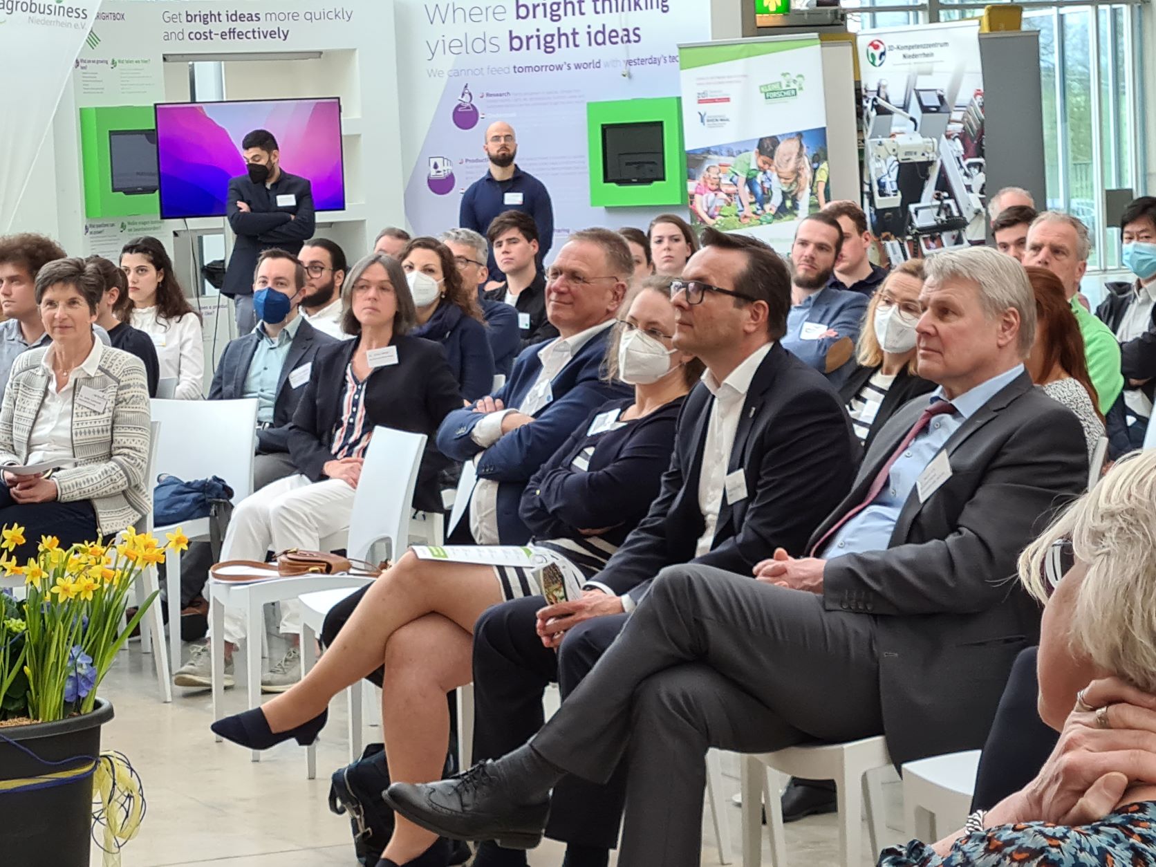 Unter den Ehrengästen des Zukunfts.Symposiums Agropole waren unter anderen Staatssekretär Dr. Heinrich Bottermann vom Ministerium für Umwelt, Landwirtschaft, Natur- und Verbraucherschutz NRW sowie Stephan Satijn, Regionalminister für Wirtschaft, Bildung und Entwicklung der Provinz Limburg. Dr. Bottermann wies in seiner Ansprache auf große Herausforderungen der Branche hin, wie zum Beispiel dem Klimawandel, der Wasserknappheit sowie den Themen Pflanzen- und Bodengesundheit. Nicht zuletzt wegen des Krieges in der Ukraine werde das Agrobusiness laut Dr. Bottermann „gerade in Zeiten knapper werdender Ressourcen eine noch größere Rolle spielen“, sodass Innovationskraft und Zusammenarbeit in der Branche von hoher Bedeutung sind.