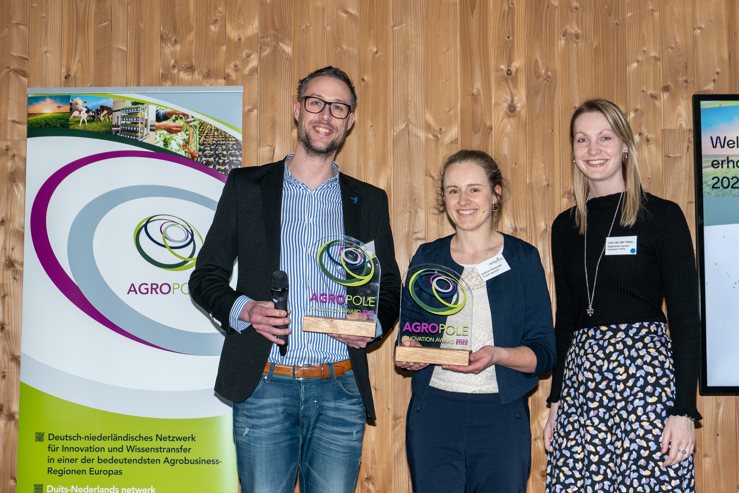 Pim Deuling vom Unternehmen AgroWizard aus Venlo nahm stellvertretend für sein Projektteam den „Agropole Innovation Award 2022“ von Agropole-Projektmitarbeiterinnen Kathrin Poetschki und Lisa van der Veen entgegen (Foto: Agrobusiness Niederrhein e.V.)