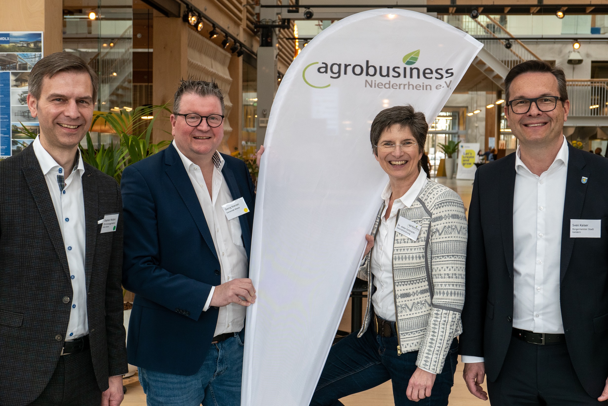 Von links: Stephan Wolters, Vorsitzender im Ausschuss für Klima, Landwirtschaft, Umwelt und Naturschutz des Kreises Kleve, Georg Koenen, Bürgermeister Weeze, Dr. Anke Schirocki, Geschäftsführung Agrobusiness Niederrhein e.V. und Sven Kaiser, Bürgermeister der Stadt Geldern und erster Vorsitzender Agrobusiness Niederrhein (Foto: Agrobusiness Niederrhein)