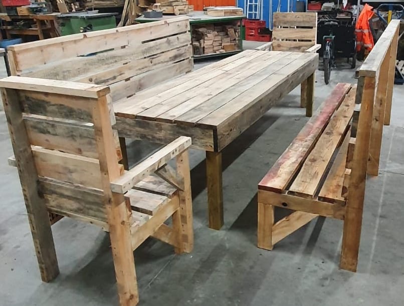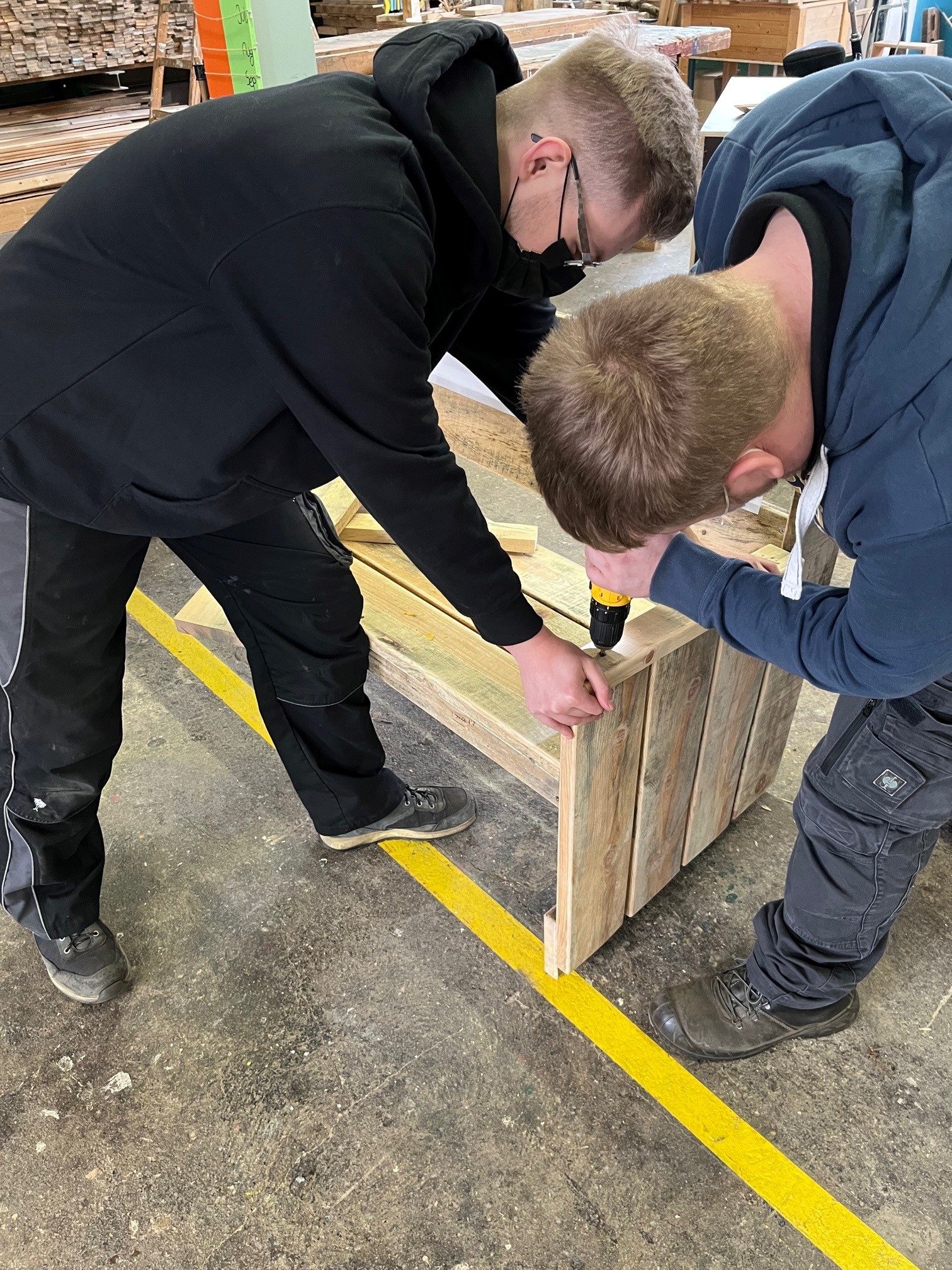Die Firma Kässbohrer in Goch stellt beispielsweise Holzbretter, die in Luftpolsterfolie eingepackt sind und als "Abstandshalter" dienen, Berufsbildungszentren in Kleve, Geldern, Rees und Emmerich zur Verfügung, die daraus zum Beispiel Lounge-Bänke herstellen.