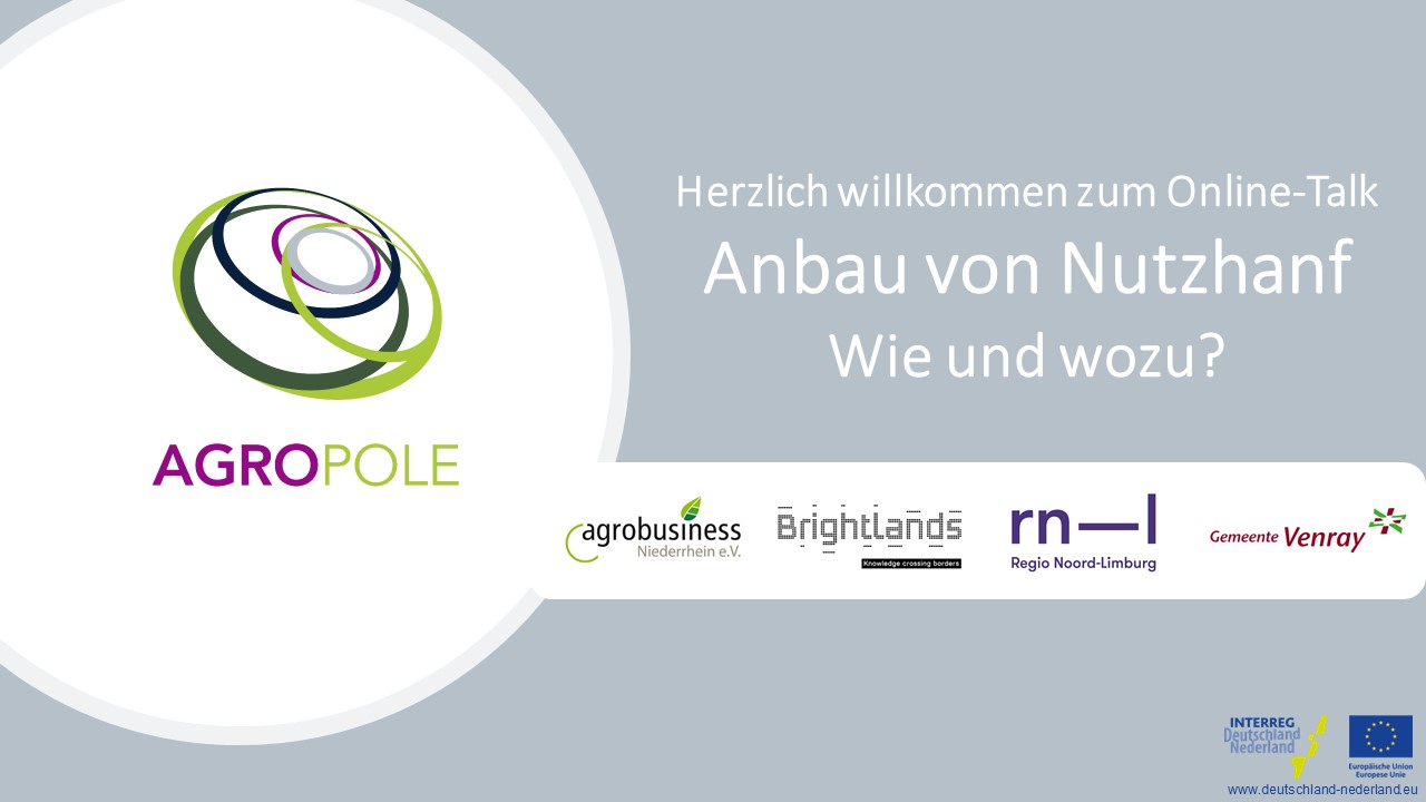 Im März veranstaltete Agrobusiness Niederrhein im Rahmen des deutsch-niederländischen INTERREG-Projekts „Agropole“ eine Online-Veranstaltung mit dem Titel „Anbau von Nutzhanf – Wie und Wozu?". Vier Experten berichteten über die Chancen und Herausforderungen, die an den gewerblichen Anbau von Nutzhanf in der deutsch-niederländischen Region geknüpft sind. Dabei ging es um die gesetzlichen Voraussetzungen, die Erfahrungen im Anbau und verschiedene Absatzmärkte.