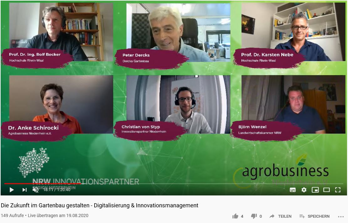 Am 19.08.2020 luden der „Innovationspartner Niederrhein“ und „Agrobusiness Niederrhein e.V.“ zu einer Online-Diskussion mit dem Thema „Die Zukunft im Gartenbau gestalten - Digitalisierung und Innovationsmanagement“ ein. Diese Diskussion ist unter folgendem Link abrufbar: https://www.youtube.com/watch?v=51O7KcuMDgM&feature=youtu.be