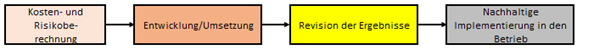 Wird das Vorhaben als wirtschaftlich erfolgreich eingestuft geht es in die Umsetzung und erste Testungen des neuen Produktionsverfahren oder durch erste Angebote und Verkäufe eines Produkts (Entwicklung/Einführung in Grafik). Die Ergebnisse werden evaluiert und bei Bedarf wird die Innovation angepasst (Revision der Ergebnisse in Grafik). Hat sich der Test als vielversprechend erwiesen, wird die Innovation nachhaltig in den Betrieb integriert (Nachhaltige Implementierung im Unternehmen in Grafik).