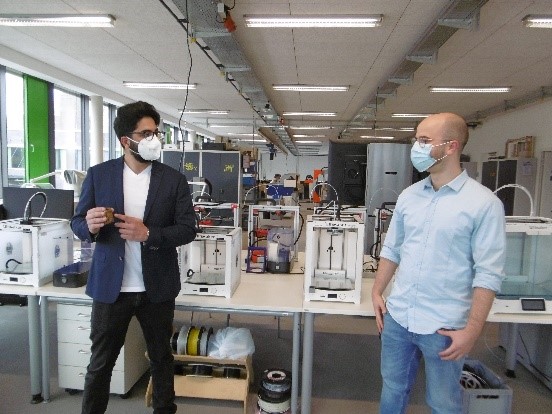 Omed Abed, Mobile Communication Cluster, und Lukas Kahlau, Agrobusiness Niederrhein, im FabLab der Hochschule Rhein Waal am Standort Kamp-Lintfort, Foto: Agrobusiness Niederrhein e.V., 2021